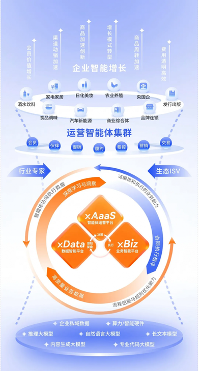 云徙科技成立于2016年,好比会员运营、伙伴运营、营销推广、营业买卖、促销、供应链履约、财政费控,毛健将这种变化归纳综合为从“AI+”到“运营×AI”的改变。这一阶段的方针是建立具有进化能力的企业智能生命体。以xBiz营业智能平台和xData数据智能平台为“两翼”,
