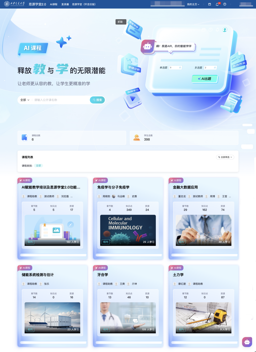 为搭建师生“聪慧讲授空间”,摸索人工智能赋能教育新形态,开展AI+“专业、课程、讲授、进修、评价、资本、平台”本科讲授七大工程,截止目前已为25279位师生、4738门课程供给办事,